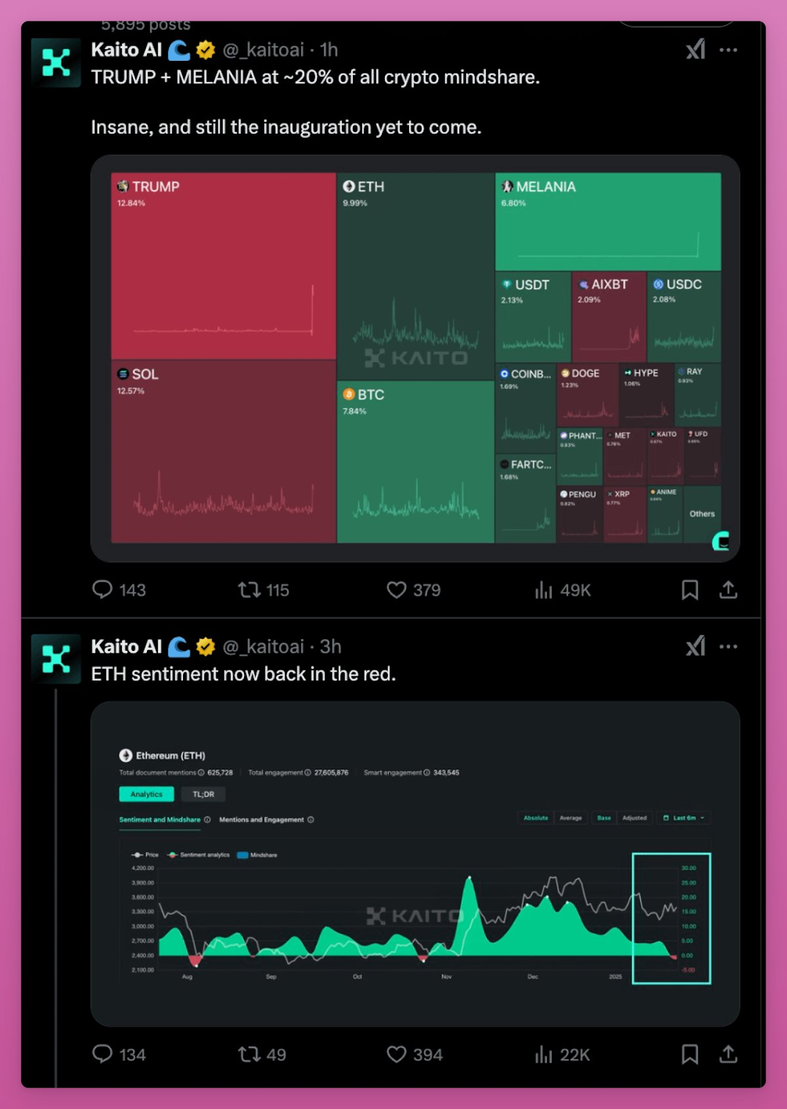 总体而言,这是属于 Solana 的疯狂周末,TRUMP、MELANIA 和 SOL 占据市场主导地位。与此同时,关于 ETH 的市场情绪再次转为负面。