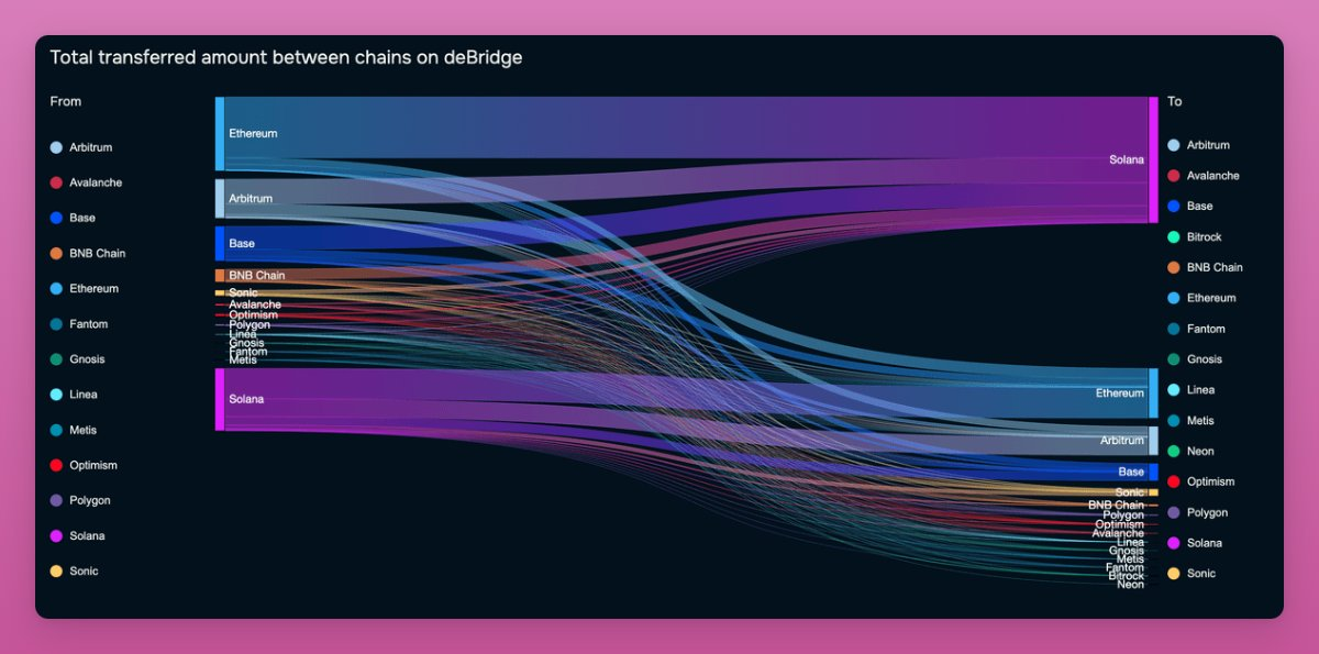 DeBridge 分析显示,每周流向 Solana 的资金约为 3 亿美元。主要来自以太坊、Base 和 Arbitrum。