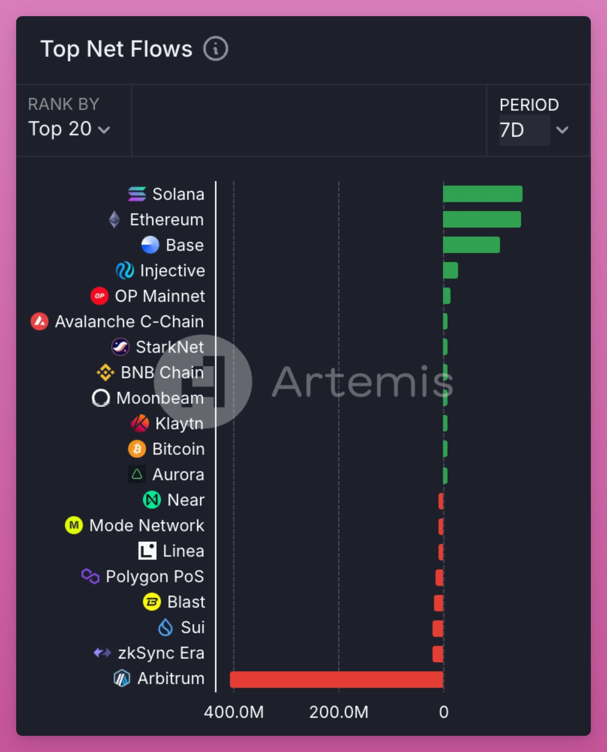 资金从 Arbitrum 流向 Solana、ETH 和 Base。