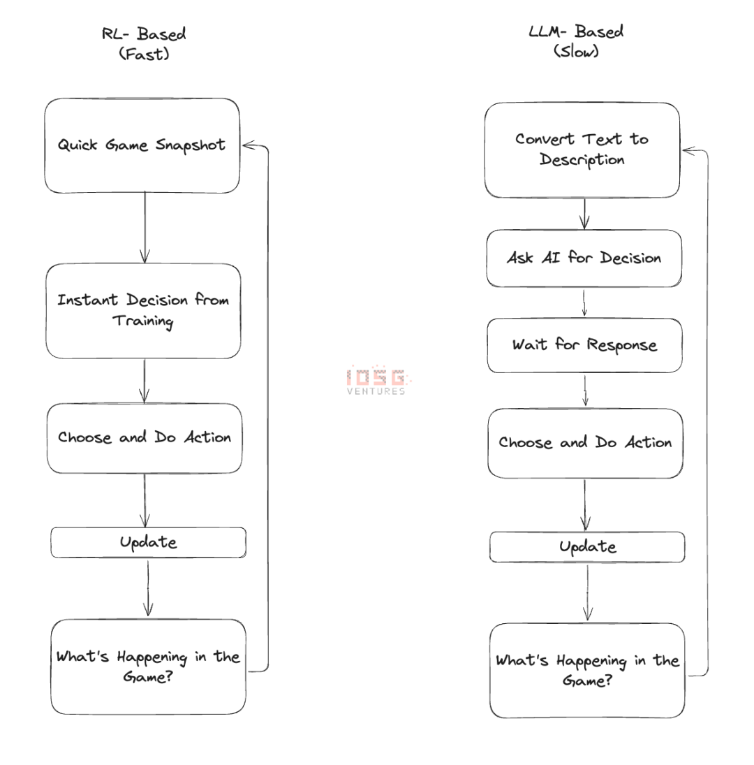 强化学习(RL)是一种不同的方式。我们把它想象成训练一个舞者,而不是通过耳麦给对方手把手的指导。通过强化学习,你需要在前期花时间教 AI 如何 “跳舞”,以及如何应对游戏中的不同情况。一旦训练有素,AI 就会自然流畅,在几毫秒内做出决定,而无需向上请求。你可以让数百个这样训练有素的代理在你的游戏中运行,每个代理都能根据自己的所见所闻独立做出决定。他们不像 LLM 代理那样能说会道或灵活机动,但他们做事快速高效。