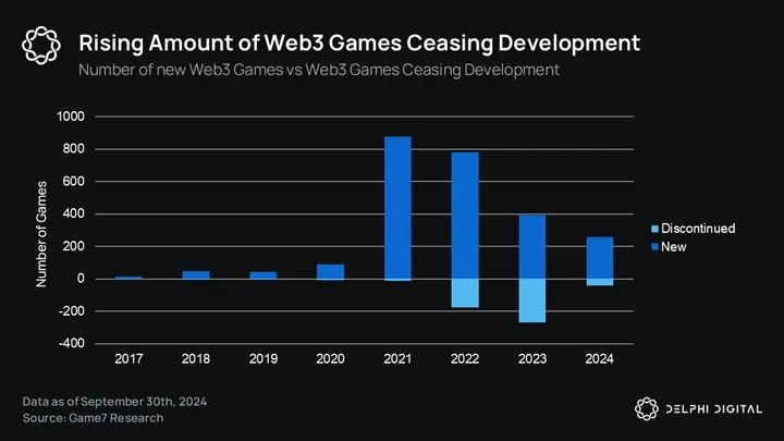 随着更新颖更具注意力的叙事方式的出现,Web3 游戏作为一个行业在一级和公开市场的叙事都退居其次。根据Delphi2024 年关于游戏产业的报告,Web3 游戏在一级市场的累计融资额不足 10 亿美元。这并不一定是坏事,这恰恰表明泡沫已经消退,现在的资本可能正在向更高质量的游戏兼容。下图就是一个明显的指标: