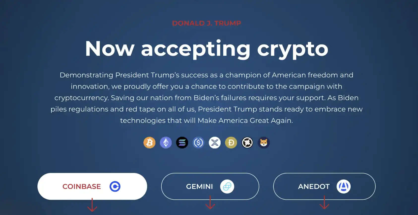 作为收个接受加密货币政治捐赠的总统,史无前例的在官网上接受了除了 BTC 还有 ETH、SOL 等主流山寨,还接受了诸如狗狗币等 Memecoin,到最后收到的加密货币价值超过了 400 万美元,而收到加密领域的行业支持者处也收到了数百万美元的传统投资。