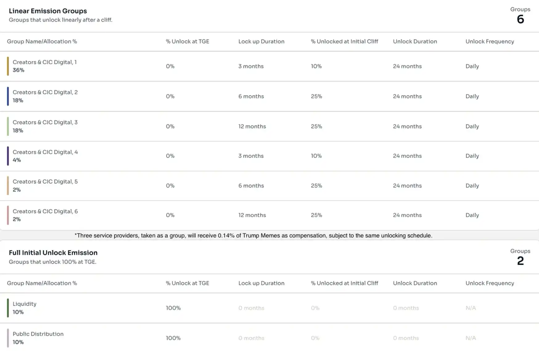 gettrumpmemes 官网显示,TRUMP 币 80% 的供应量由特朗普集团的附属公司 CIC Digital 和 CIC 共同拥有的实体 Fight Fight Fight LLC 持有。官网还表示,TRUMP 币第一天的初始发行量为 2 亿枚,三年内预计发行量将达到 10 亿枚,分 3 年逐步增加,CIC Digital 及其关联方将获得 TRUMP 交易活动产生的收入,锁定 3-12 个月,未来 24 个月内解锁。