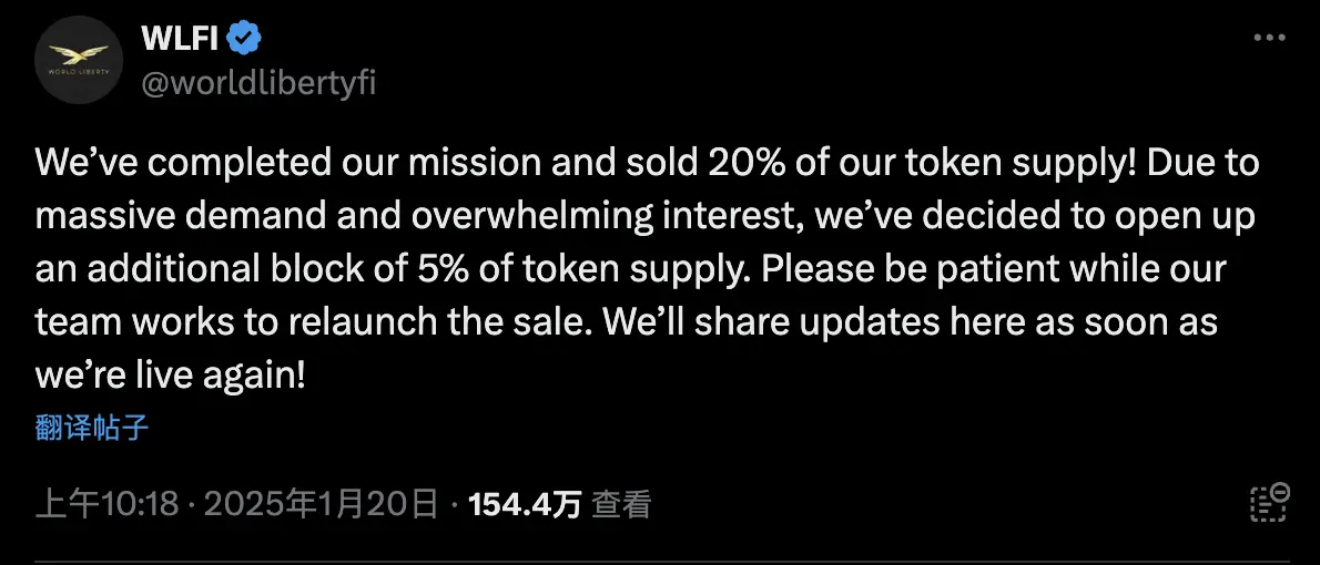 而随着原定 20% 的公售额度的售罄,WLFI 又「大发慈悲」的开放了额外 5% 的额度供社区购买,如果再次打满的话,这 3 亿美元的价值的链上地址还能够再添 7500 万美元。