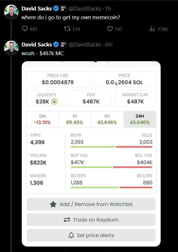 虽然当人们开始购买时,他九次发推文告诉他们不要购买,但这已经坐实了他「曾经发过币」的证据,这与发$TRUMP 币的手法一模一样。(据社区成员反馈,David Sacks 最近删除了自己有关$Sacks 的帖子。)