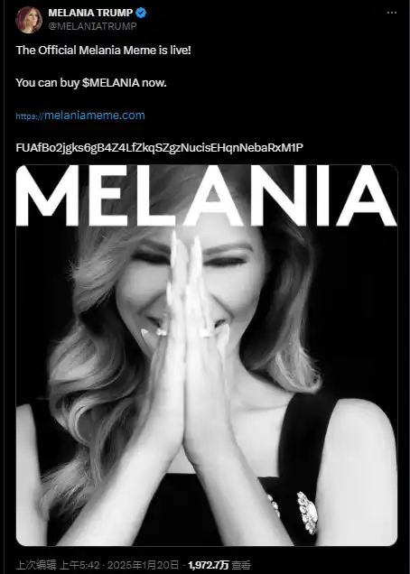 而当$Trump 正如日中天、极度 fomo 之时,特朗普的夫人梅拉尼娅也趁势在 Solana 链上推出了自己的加密货币 MELANIA。20 日梅拉尼娅在社交媒体上发文称,「Melania 官方 Meme 上线了」,并附上了购买链接。