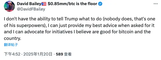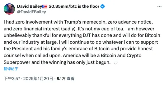 作为竞选时期的加密顾问,David Bailey 现在的定位更像是特朗普与社区的润滑剂。即使他并不认同特朗普的发币计划,但他还是尽力安抚社区:「我非常感激特朗普 为比特币和整个行业所做的一切以及将要做的一切」、「Ross 被释放等一系列事件都会被实现的」、「我将继续尽我所能支持总统及其家人对比特币的接受,并在需要时提供诚实的建议」……