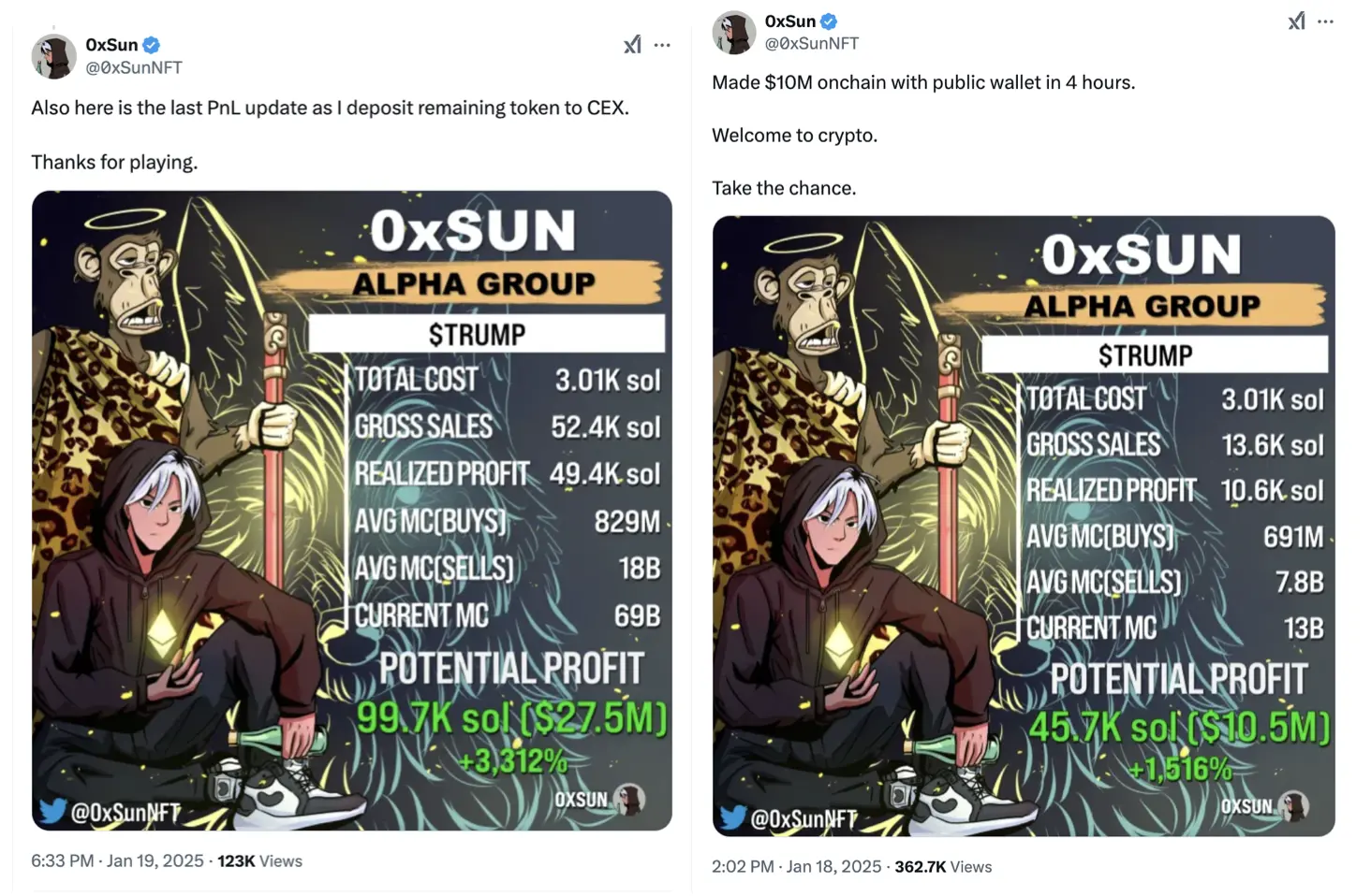 当 TRUMP 市值上涨至 150 亿美元,即发币仅 4 小时后,中文 KOL 0xSun 便在 X 上公布了自己的 TRUMP PnL,总成本 3010 枚 SOL,盈利 1000 万美元。一天后,0xSun 将 TRUMP 转入 CEX 之前最后一次更新 PnL 显示其已盈利 2750 万美元。