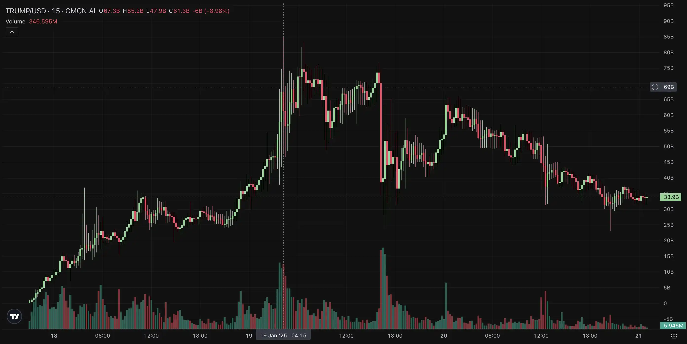 起初,市场对此消息仍有质疑,猜测特朗普账号或许被盗,但数小时后,该文仍旧存在且没有辟谣,TRUMP 币一路势如破竹迅速上涨。代币发行 12 小时后,其交易价格达到约 30 美元,FDV 高达 300 亿美元。截至北京时间 1 月 19 日晚 8 点,根据 CoinMarketCap 数据,TRUMP 币的价格在发币一天半的时间内已上涨至最高 85.2 美元,全流通市值最高 852 亿美元,特朗普身价由此大涨 681.6 亿美元(约合 4989.3 亿元人民币),相较于其发币之前的身价大涨超 10 倍。