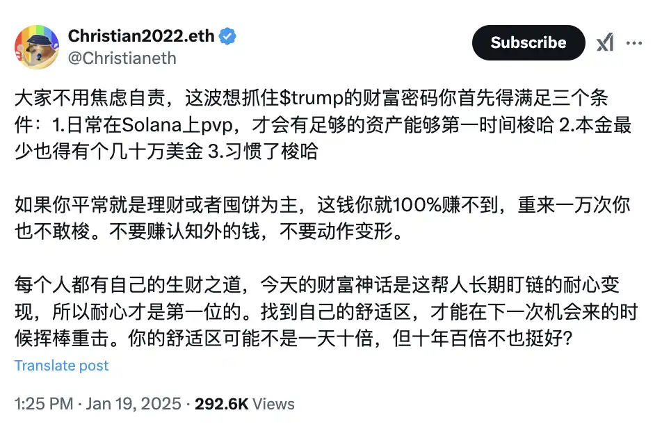 「是 4 个小时,也是 3 年前进圈开始就住在链上,日均超过 10 小时的枯坐」,0xSun 在一条推文中这样写道。TRUMP 市值一路飙升突破 300 亿美元时,中文社区中除了惊诧、感叹自己没有拿到底部筹码之外,还有一部分人在反思自己为何没有抓住这个机会。0xinfini 创始人 Christian 给出了答案,他认为 Solana 链上如果没有一定的本金以及第一时间 all in,是无法在 TRUMP 上拿到大结果的。