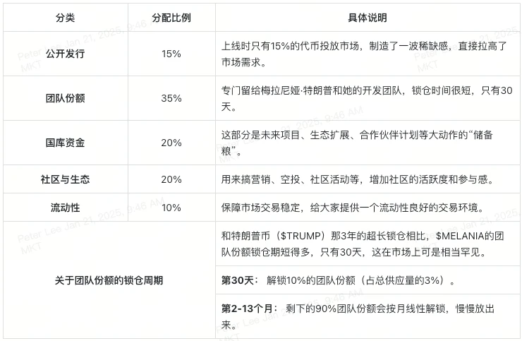 $MELANIA 的分配方式设计得相当巧妙,既保持市场的稀缺性,也让玩家们有足够的参与空间: