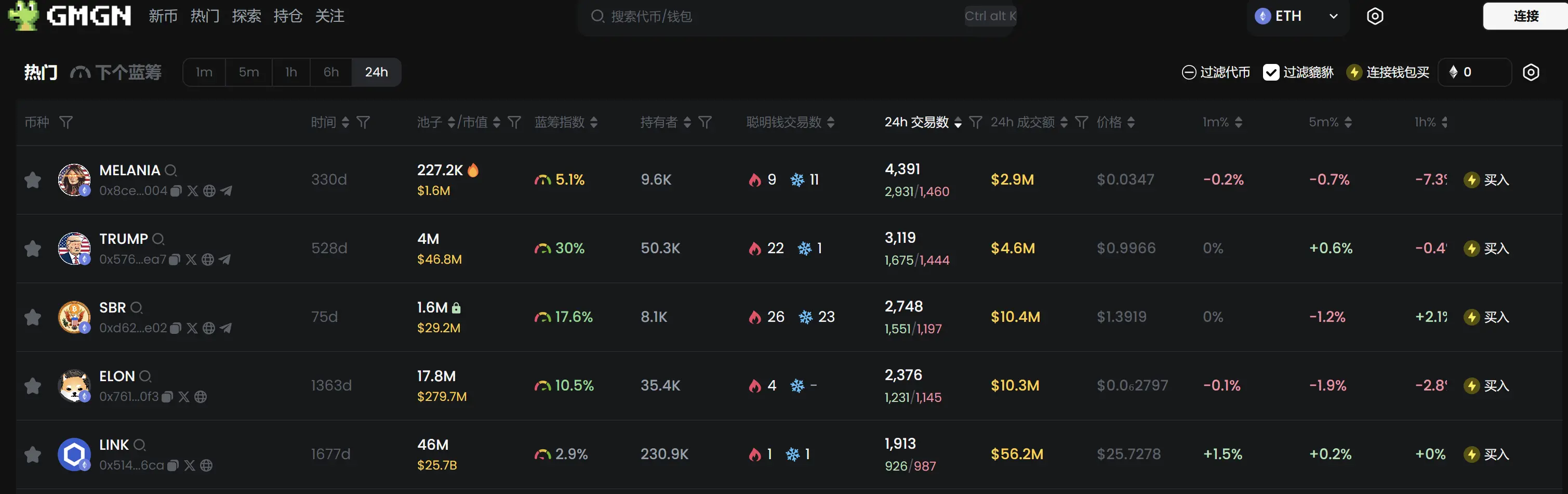 过去 24h 以太坊热门代币前五依次为:MELANIA 、 TRUMP 、SBR 、ELON、LINK