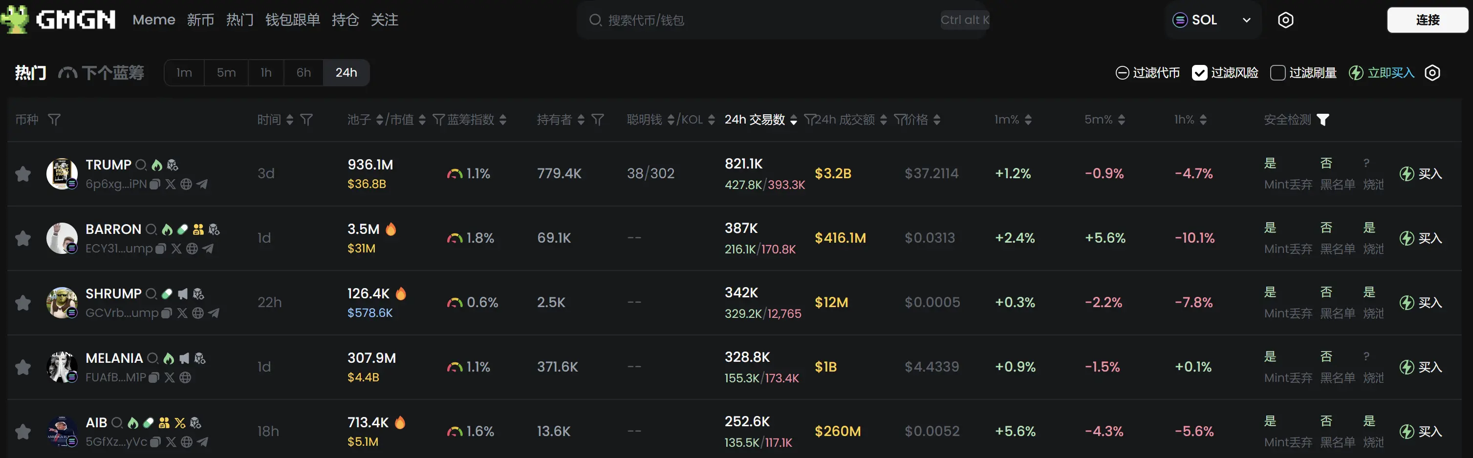过去 24h Solana 热门代币前五依次为: TRUMP 、 BARRON 、SHRUMP、MELANIA 、AIB