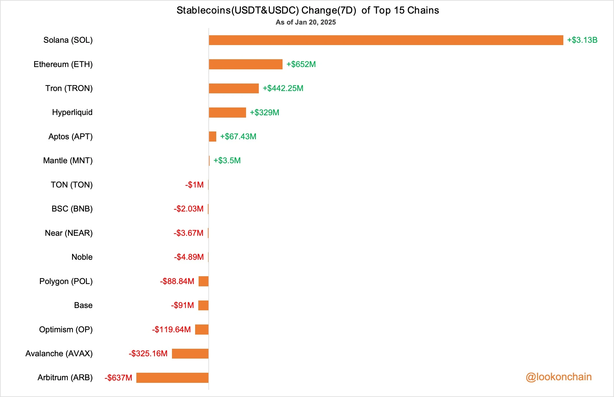 与此同时, 据 Lookonchain 监测, 过去 7 天内,Solana 上的稳定币(USDT 和 USDC)的总额增加了 31.3 亿美元,显示出市场对 Solana 生态的持续看好。