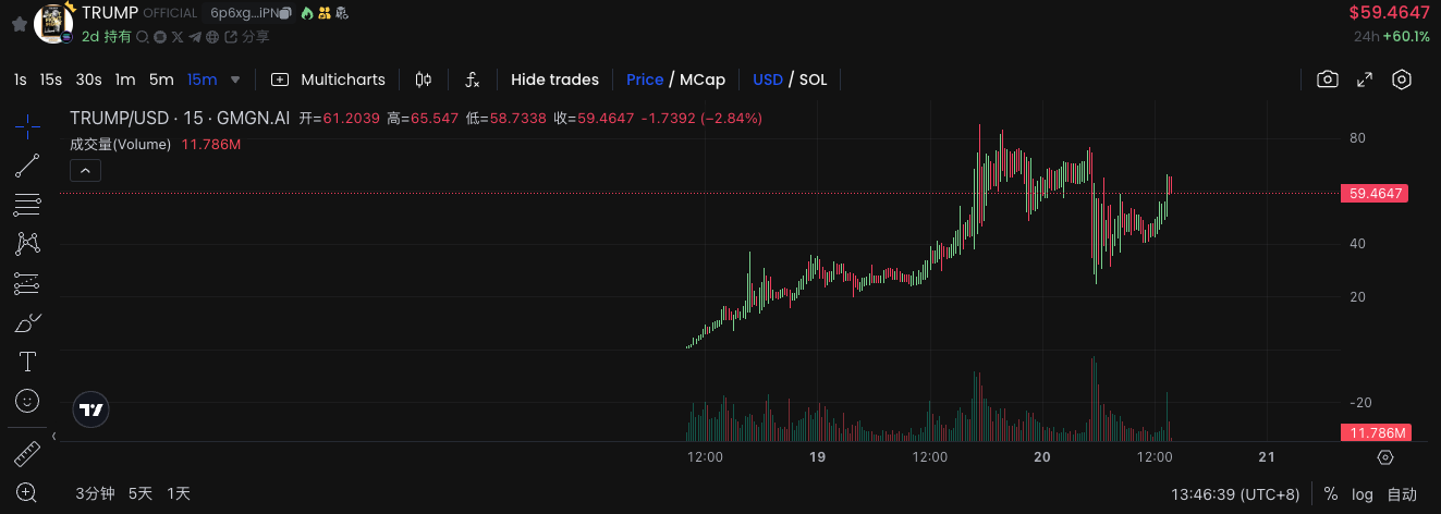 之后的剧情发展可能颠覆了包括 Web3 行业内外所有人的意料,总量 10 亿枚,仅释放了 20% 的 TRUMP,价格开始了一路飙升。据 GMGN 数据,该代币价格从最初周六 10:00 的 0.18 美元涨至昨日 17:00 左右创下的 80 美元左右的高点。在周末时间完成了一项不可能完成的任务。
