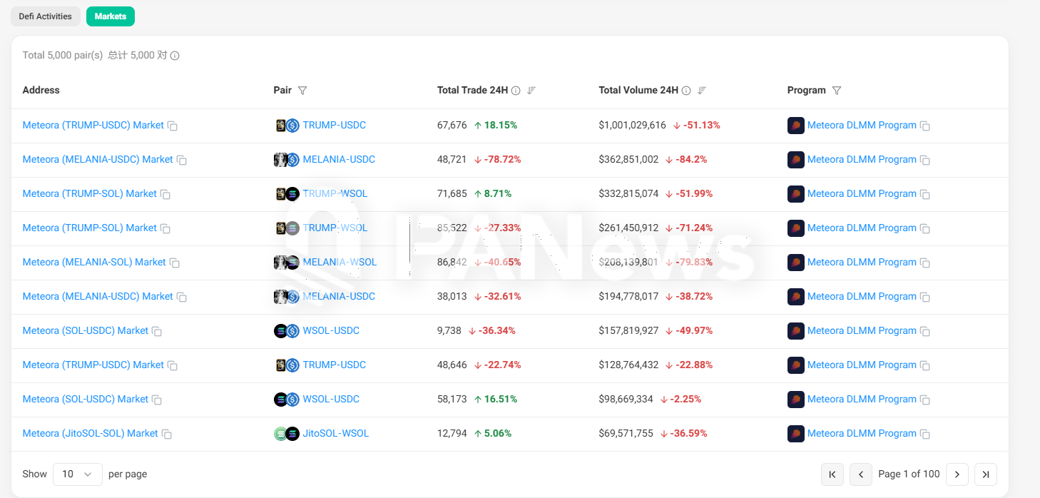 而这些变化的主因则明显来自于特朗普家族发行代币的风潮。从数据上来看,直至1月21日,Meteora上前十最热门的交易对当中,有七个都是和特朗普代币相关的,主要围绕着TRUMP和MELANIA这两个代币。