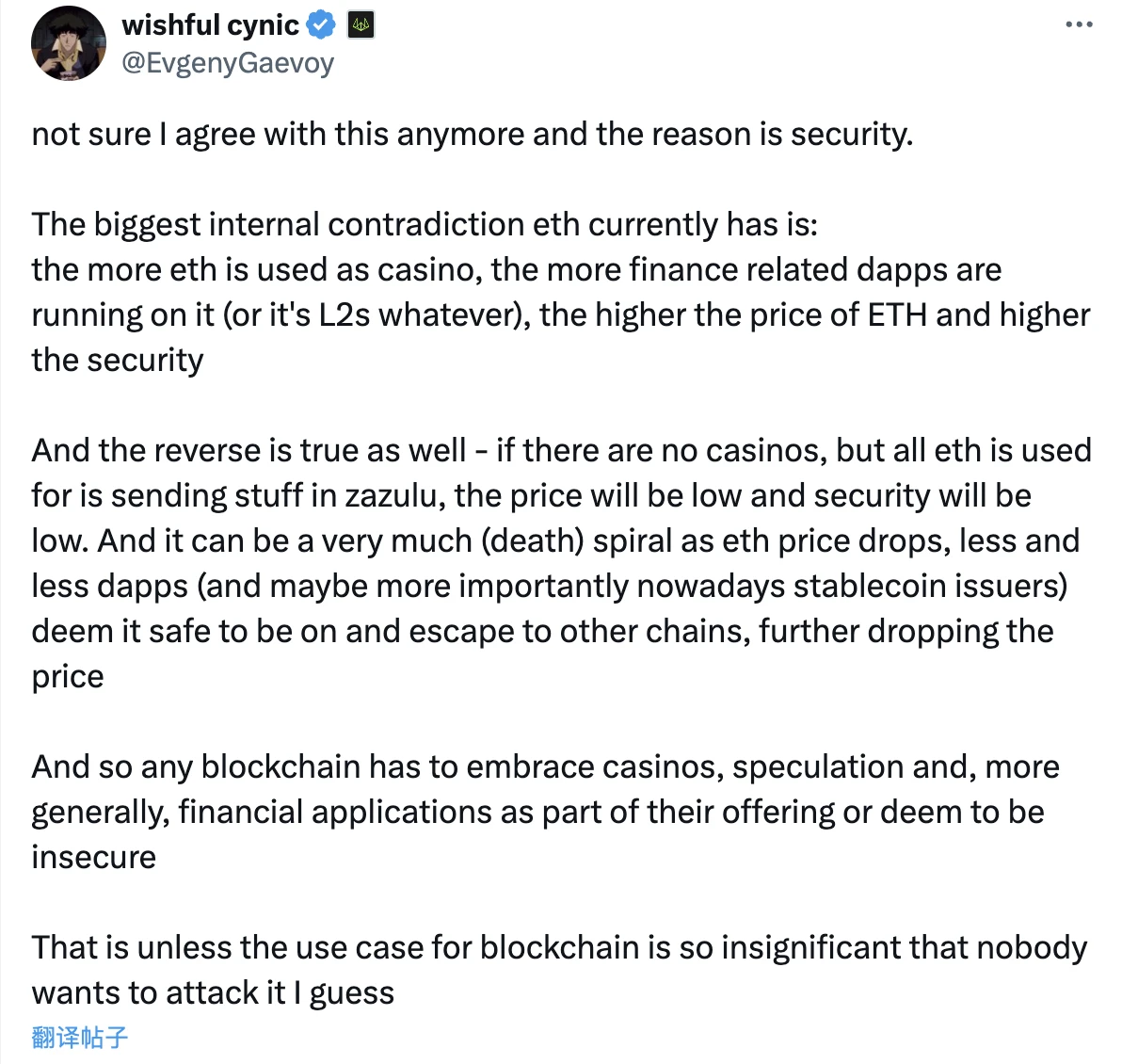 Evgeny 表示,以太坊目前最大的内部矛盾是:越多的 ETH 被用作“赌博”,越多与金融相关的 Dapp 在以太坊之上运行,ETH 的价格就越高,安全性就越高;反过来,如果没有赌博行为,ETH 只被用作在 Zazulu 转账,那么 ETH 的价格就会很低,安全性也会很低。随着 ETH 价格的下降,认为以太坊依旧安全的 Dapp 也会越来越少并逃到其他链上,从而进一步降低 ETH 价格,这可能是一个非常大的死亡螺旋。