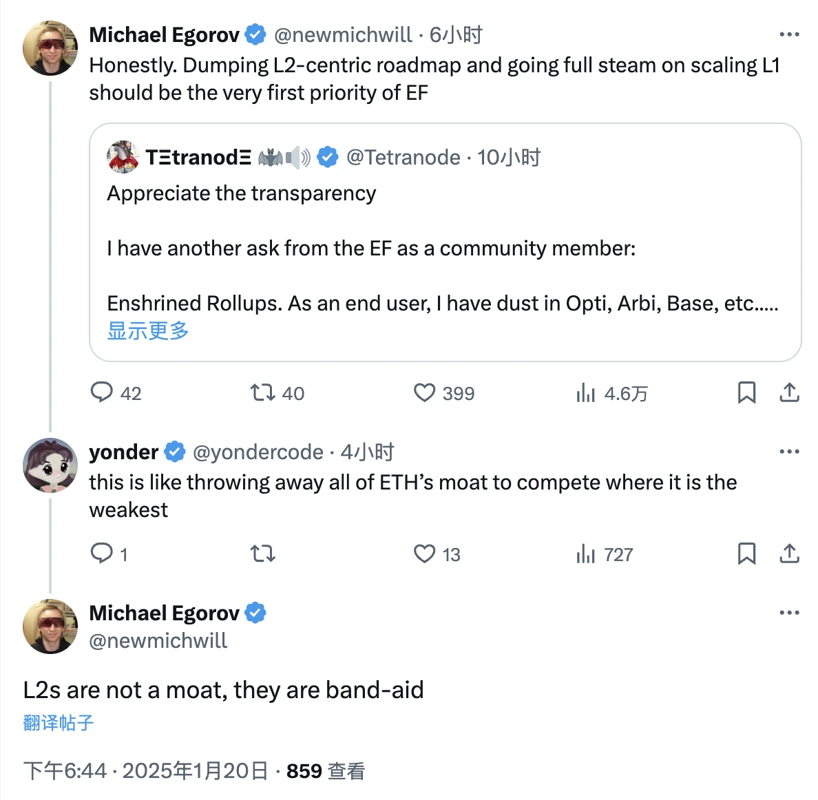 在之后和社区成员的讨论中,Egorov 还直言:“Layer2 不是护城河,而是创可贴。”