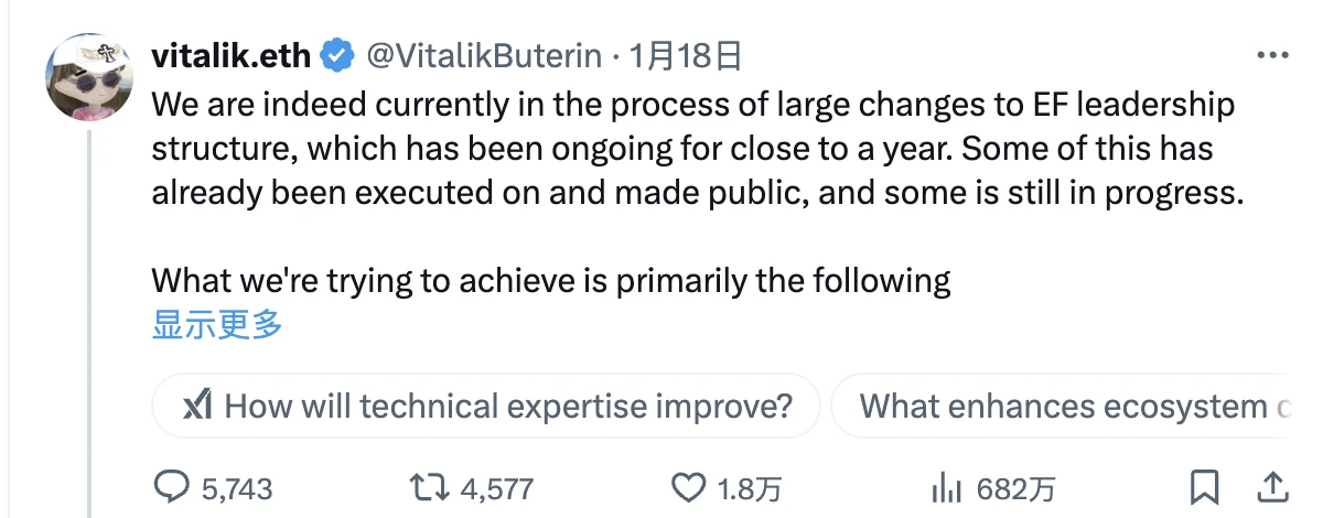 过去几天,整个以太坊社区都在围绕着 EF 的领导结构、人员组成、运行模式、财务计划进行着讨论,现任 EF 执行董事 Aya Miyaguchi 被社区口诛笔伐,Vitalik 本人也在重压之下不得不公开表态“正对 EF 领导层结构进行大规模变革”。