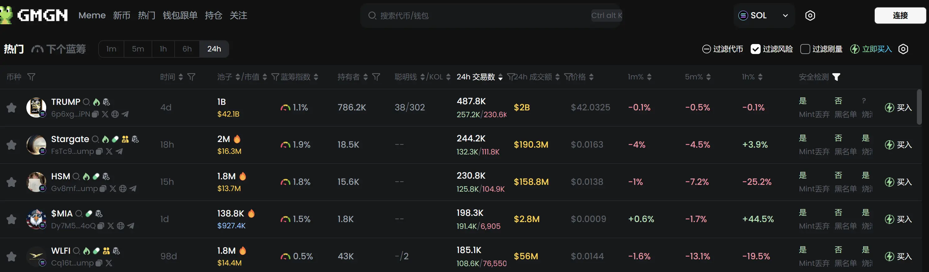 过去 24h Solana 热门代币前五依次为: TRUMP 、Stargate 、HSM、$MIA 、WLFI