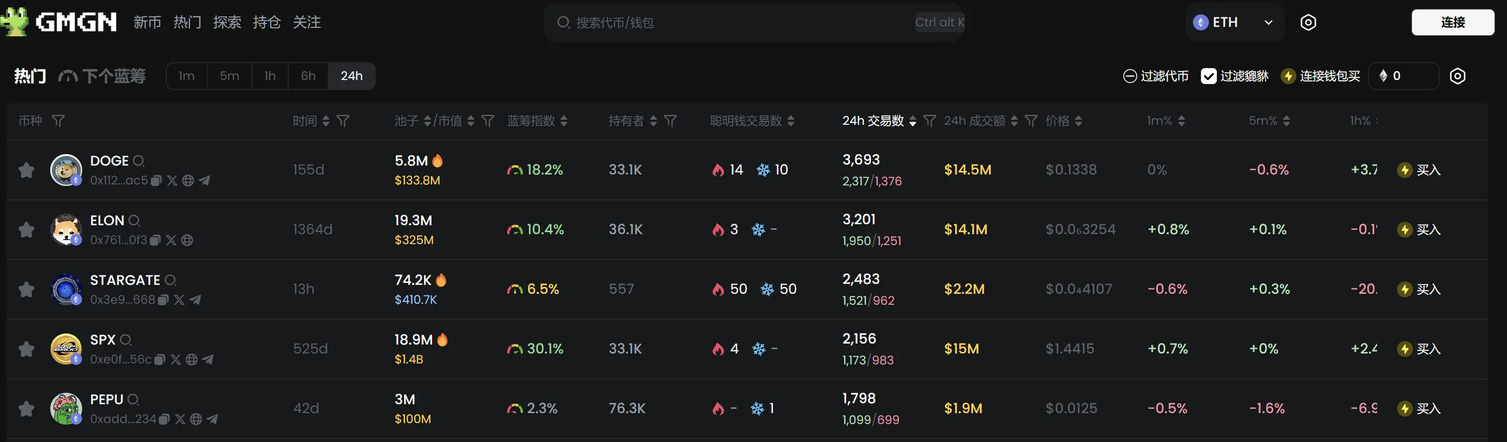 过去 24h 以太坊热门代币前五依次为:DOGE 、 ELON 、STARGATE 、SPX、PEPU