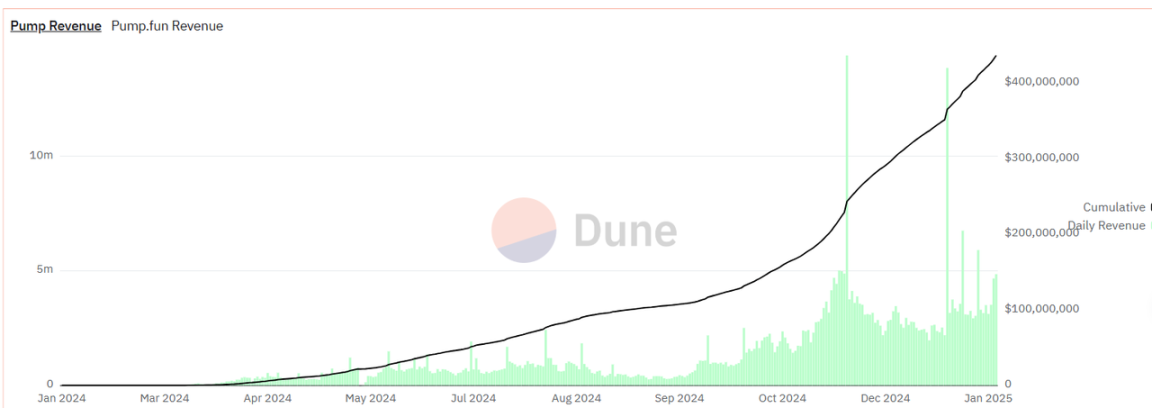 Solana 在 AI 概念币以及模因币上牢牢占据市场主动权。Dune 数据显示,其发行启动平台 Pump.fun 累计收入截止目前已经超 4 亿美元。