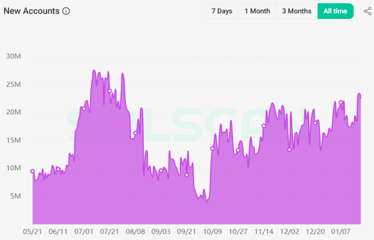 其每日新增账户数(以单账户有多个代币计算),也维持在 2000 万个的历史高位。