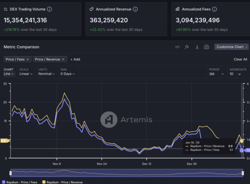 作为模因流动性基础设施的 Raydium 年化收入为 3.63 亿美元,年化费用超过 30 亿美元。过去 3 个月,费用增长超过 370%,收入增长超过 260%。市值费用比为 1.1 倍,市值收入比为 9.6 倍。