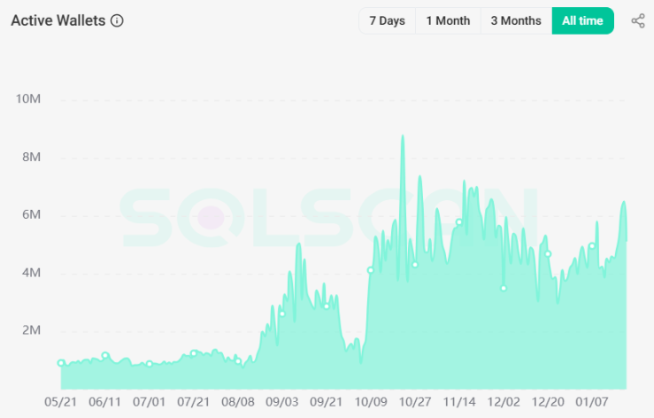目前,据 Solscam 数据显示,其活跃钱包数维持在 600 万个的高位,比 2024 年 5 月,增长近 6 倍。