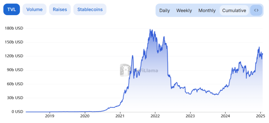 时间快进到本轮周期,新 DeFi 协议中的借贷、衍生品并未有太多亮点吸引到资金狂潮,反而纷纷选择自己选择做链,价值捕获也并未流向以太坊。部分 DeFi 协议代币,重复造轮子,上线即巅峰,也拖累了市场本就岌岌可危的情绪面。自 2023 年以来,DeFi 的高光时刻仅仅出现在去年 Q4 的高潮阶段,随即再度淹没于模因与 AI 浪潮之中。数据显示,目前 DeFi 总 TVL 仍不及上轮周期创下的 1800 亿美元巅峰。