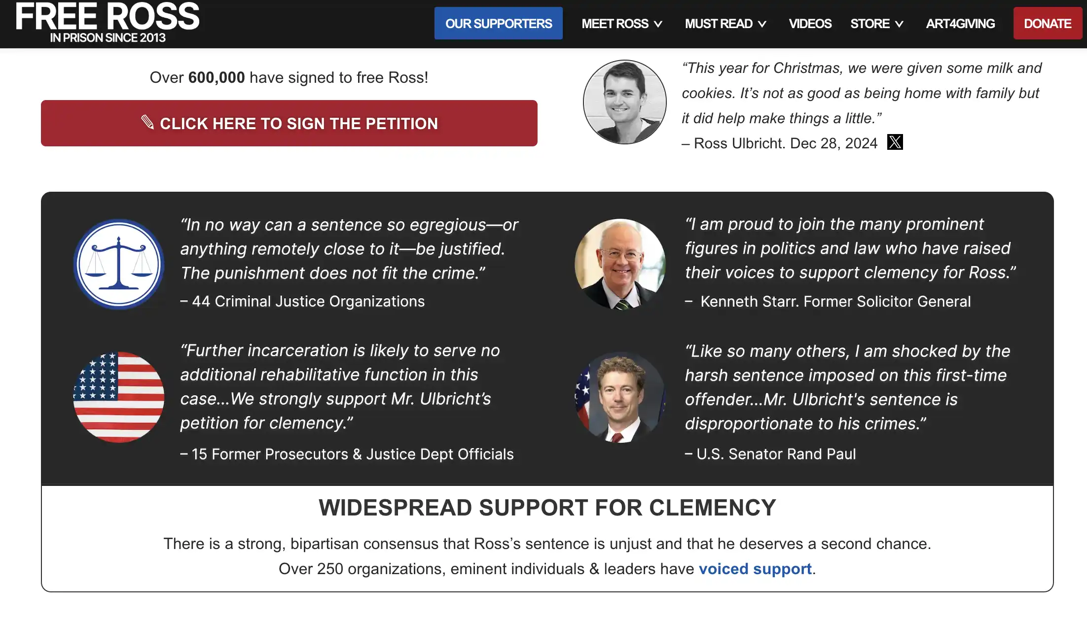 因对自由主义的实践,Ross 入狱的 11 年里,包括加密行业在内的社会上仍一直存在对宽大处理的广泛支持,两党中也有许多人认为 Ross 的判决是不公正的,他应该得到第二次机会。超过 250 个组织、知名人士和领导人表示支持,有超过 60 万人签名请愿书释放 Ross。