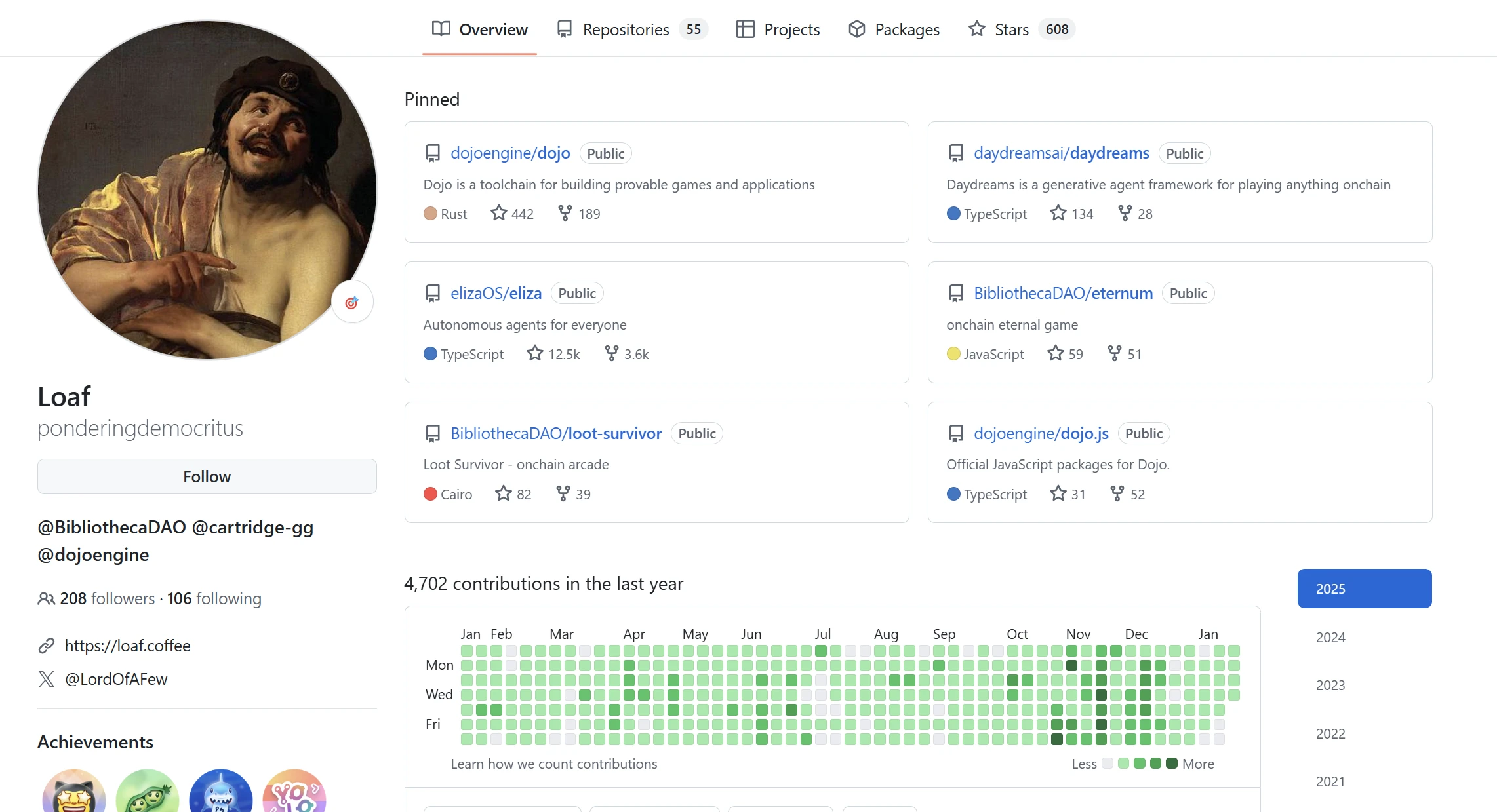 该项目目前的亮点同样为其 dev @lordOfAFew,他是 StarkNet 生态链游 Realms.World 和 Cartridge 的贡献者之一,同时在 Github 上有长期、多项目的建设成果。