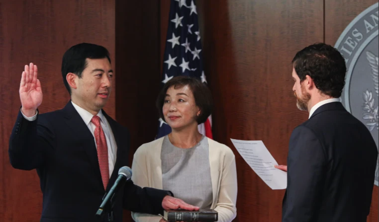 Mark Uyeda(上田马克,左一)宣誓上任成为 SEC 委员。来源:YouTube