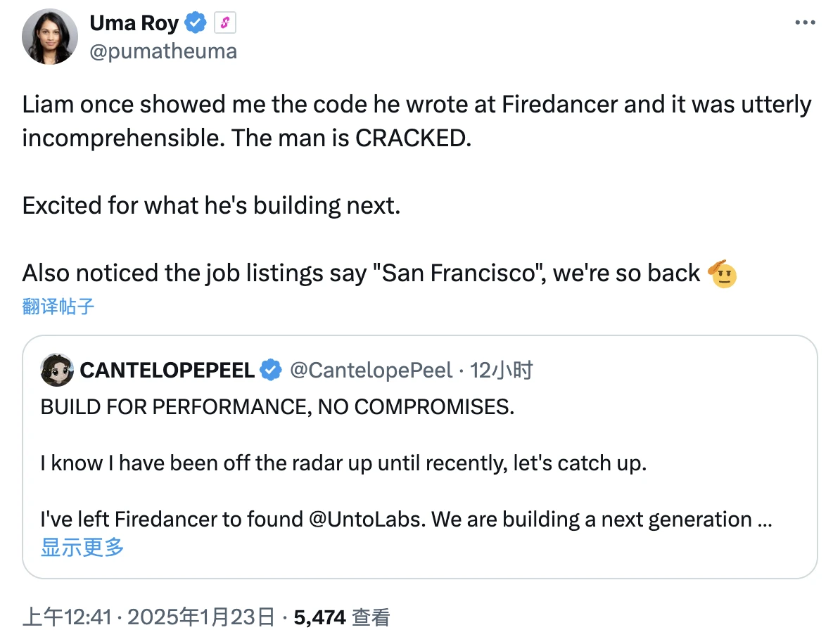 Succinct 开发者 Uma Roy 则表示:“Liam 曾经向我展示过他在 Firedancer 写的代码,简直难以置信。这个人是个疯子!我对他接下来要建造的东西感到很兴奋。”