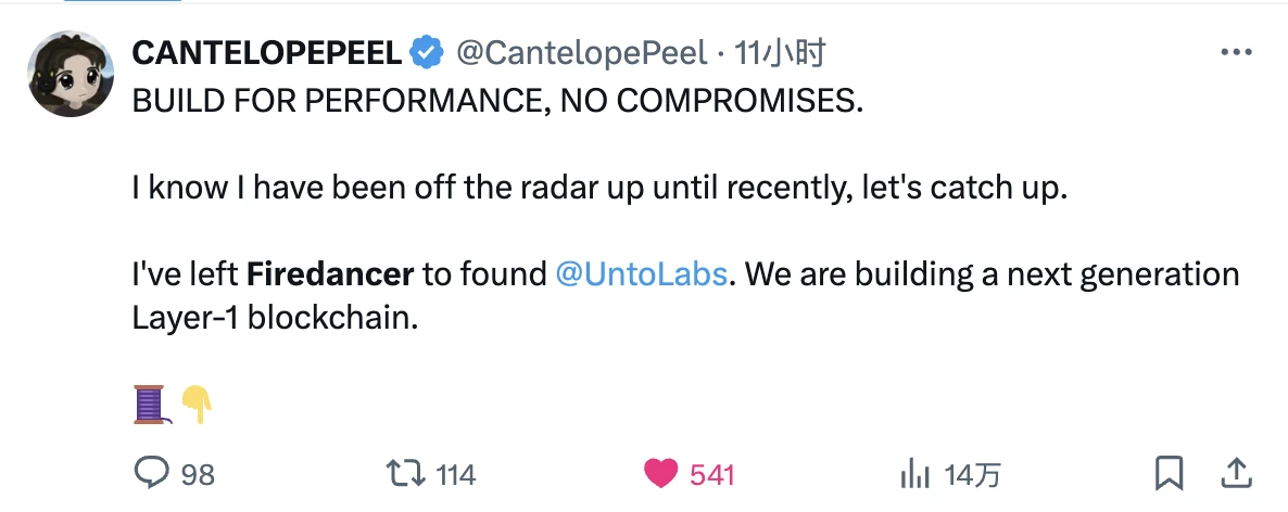 凌晨时分,Solana 核心开发者 Cantelopepeel 宣布将从 Solana 客户端团队 Firedancer 离职并创建 Unto Labs。Cantelopepeel 称 Unto Labs 将构建新一代 Layer 1 区块链,该链将“专为性能打造,绝不妥协”。