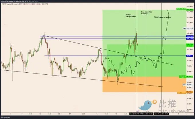 加密交易员 Krillin 在 X 平台暗示,在 1 月 28 日至 29 日联邦公开市场委员会 (FOMC) 会议召开之前,比特币价格可能在 10 万至 11 万美元之间横盘整理。这位交易员表示:「除非出现一些意外情况,例如日本央行采取一些出乎意料的货币政策,我们可能会在 10 万到 11 万美元之间震荡,直到本月底的 FOMC 会议结束。」