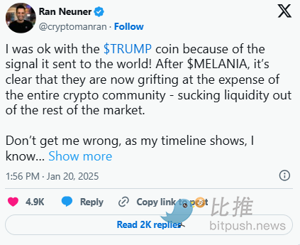 不过,至少有一位知名的加密货币人士似乎公开吹嘘自己提前收到了有关即将推出的 MELANIA 代币的内部信息。区块链投资基金 Onchain Capital 的联合创始人兼首席执行官 Ran Neuner 在周一于 X的一篇贴文中承认了这一点,他哀叹特朗普一家现在“以牺牲加密货币社区为代价来行骗”。
