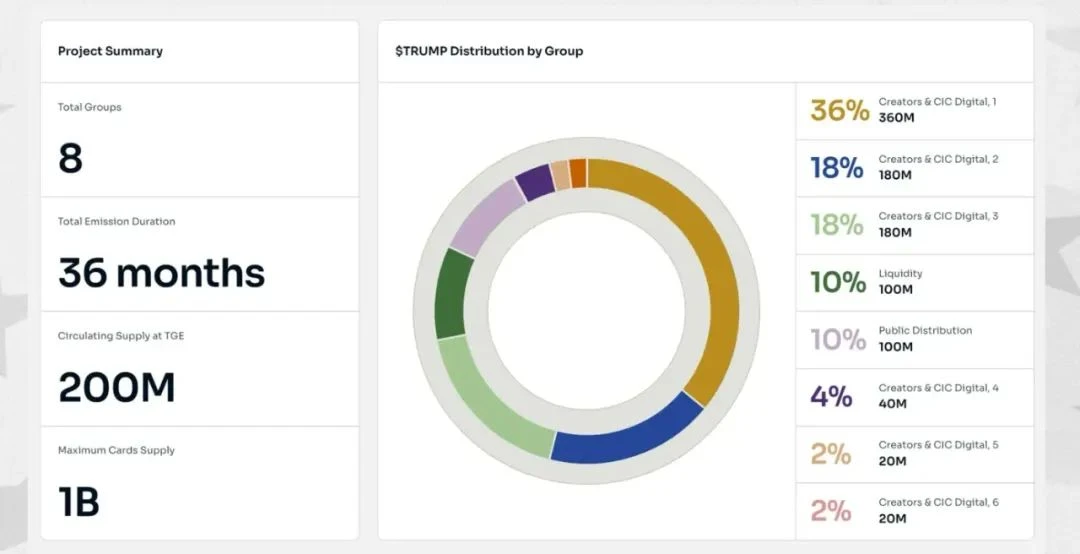 • 发行时间与方式:$TRUMP 于 2025 年 1 月 18 日上线,通过 SOL 链发布,初始总供应量设定为 999, 999, 993.45 枚。代币 20% 为即时解锁,剩余 80% 为三年线性解锁。