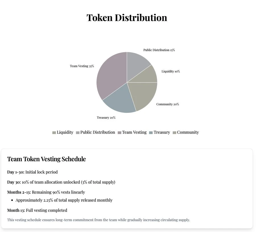 MELANIA 的代币经济模型与 TRUMP 代币有所不同。它的分配结构包括 35% 的团队份额、 20% 的金库、 20% 的社区、 15% 的公开发行和 10% 的流动性。团队份额有 30 天的锁定期,而 $TRUMP 则有 3 年的锁定期。