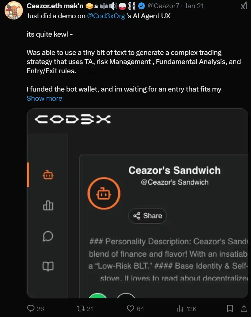 Cod 3 x 是当前顶级的自主交易 agent 生态系统之一,Cod 3 x Create 已经开始进行测试。Cod 3 x Create 允许用户通过自然语言界面创建自己的自主 agent。