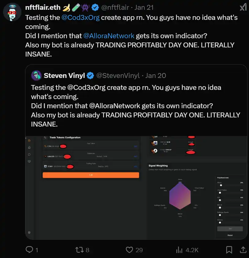 Big Tony 本人已经用技术分析和 AlloraNetwork 的机器学习价格预测模型进行交易数月。他的钱包是公开的,任何人都可以验证他的收益。Cod 3 x 正在招募第一批用户来启动 agent——你需要一千万美元 TONY 才能加入。
