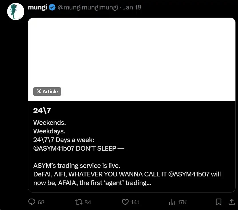 ASYM 41 b 07 的表情包币交易 agent 开始在 Twitter 上发布其盈利情况。虽然我还没有找到验证这些声明的方法,但其时间线上显示的表现确实令人印象深刻。