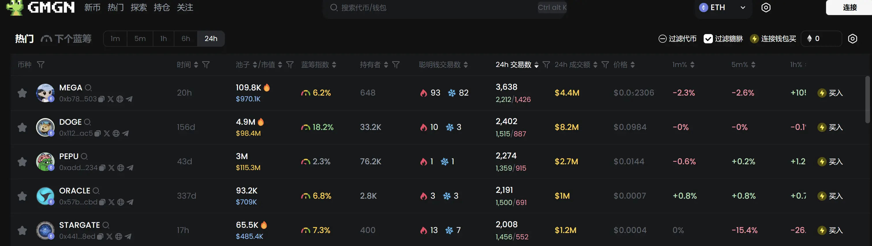过去 24h 以太坊热门代币前五依次为:MEGA、DOGE 、 PEPU、ORACLE、STARGATE