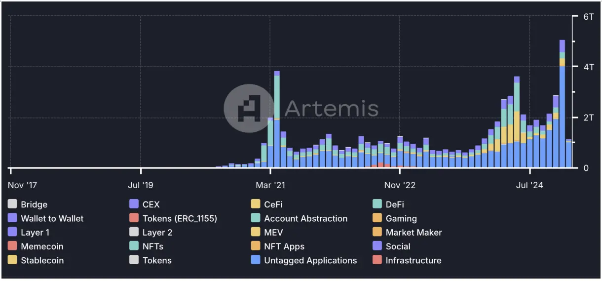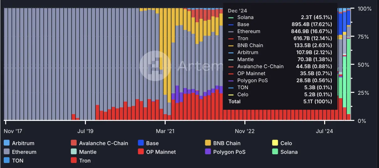 基础设施方面,按照 Artemis 的数据,2024年12月,Solana 以2.3万亿美元的月结算额占比 45.1%,排名第一;Base 以8954亿美元占比17.62%,排名第二;Ethereum 以 8469亿美元占比16.67%,排名第三。