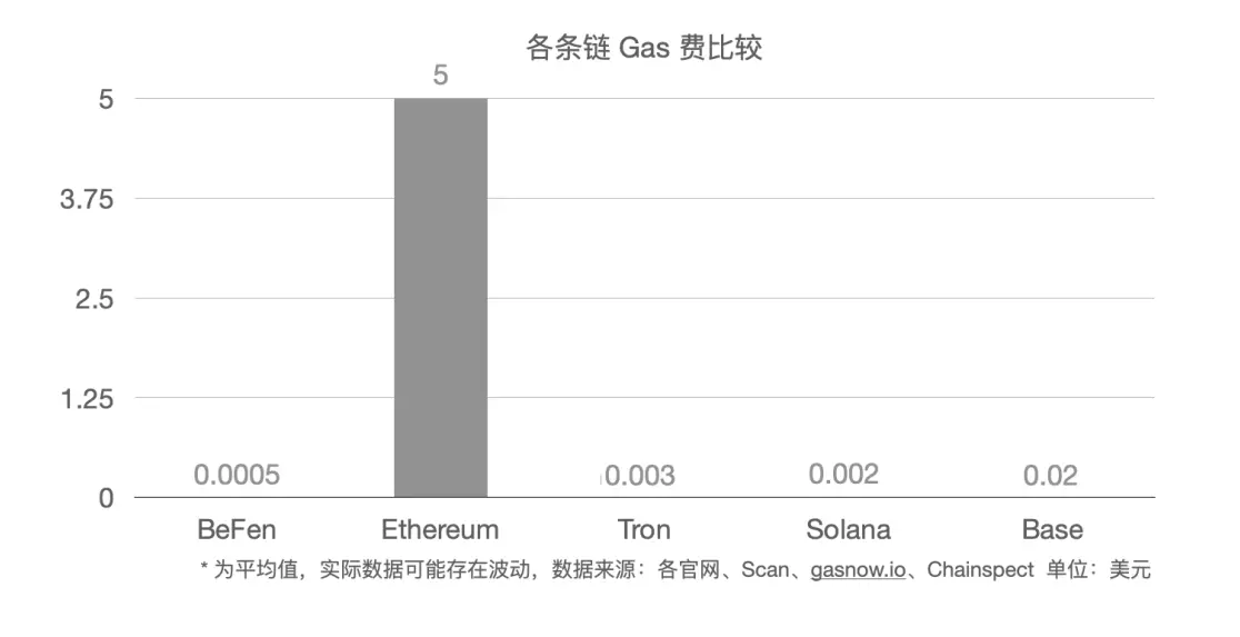 在 Gas 费方面,BenFen 链拥有着极低的费用,费用越低,越利于在实际支付场景中被采用。BenFen 链可以做到低于 0.1美分/笔的 Gas 费,而 Ethereum 的 Gas 费约为5美元。
