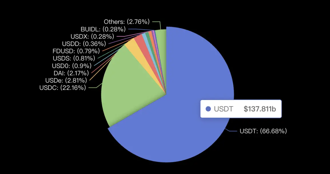 从发行规模来看,按照 DeFillama 的数据,截止2025年1月,USDT 以 1378亿 美元排名第一,占比66.7%;USDC 以 458亿美元的发行规模排名第二,占比22.16%;USDe 以 58.1 亿美元排名第三,占比2.81%;DAI 以 44.8亿美元的规模排名第四,占比2.17%。