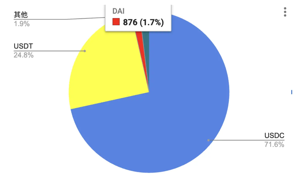 从结算量来看,按照 Artemis 2024年12月的数据,USDC 月结算额为3.6万亿美元,占比 71.6%,排名第一;USDT 以 1.3万亿美元,占比24.8%,排名第二;DAI 以 876亿美元月结算额,占比1.7%,排名第三。