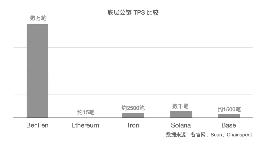 在TPS 方面,BenFen 链拥有着每秒数万笔的交易量,高于其他链。TPS 越高,可以承载的结算量也就越大,可以支撑更大规模的支付、转账业务。