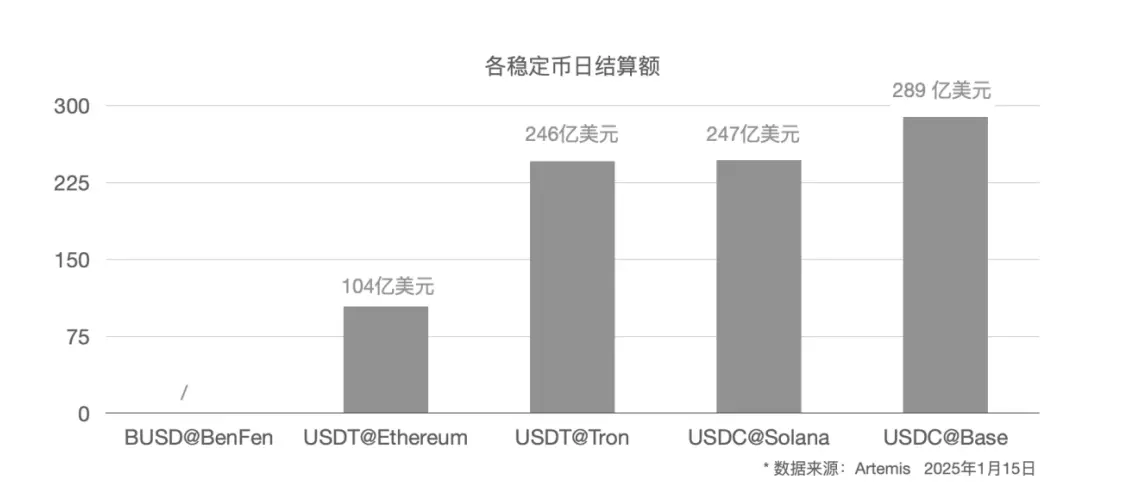 在结算额方面,BenFen 的 BUSD 由于上线不久,结算额忽略不计。Base 上 的 USDC 表现优异,以289亿美元的日结算额排名第一,Solana 上的 USDC 以247亿美元结算额排名第二。USDT 在 Tron 和 Ethereum 上的结算额分别为 246亿美元、104亿美元排名第三、第四。