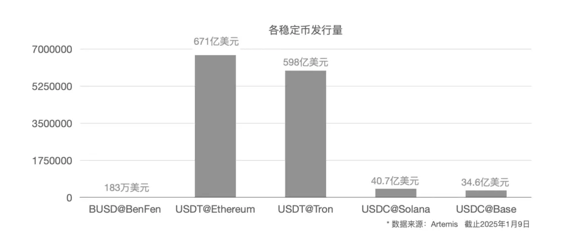 发行量方面,目前由于 BenFen 启动不久,总发行量为 183万美元,USDT 在 Ethereum 上的发行量为671亿美元处于第一位,在Tron 上的发行量为 598亿美元,处于第二位。USDC 在 Solana 和 Base 上的发行量为40.7亿美元、34.6亿美元,处于第三、四位。